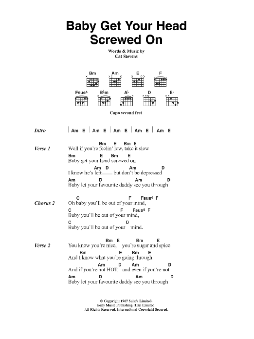 Download or print Cat Stevens Baby Get Your Head Screwed On sheet music, chords and digital score arranged for Guitar Chords/Lyrics. This Pop score includes 2 page(s).