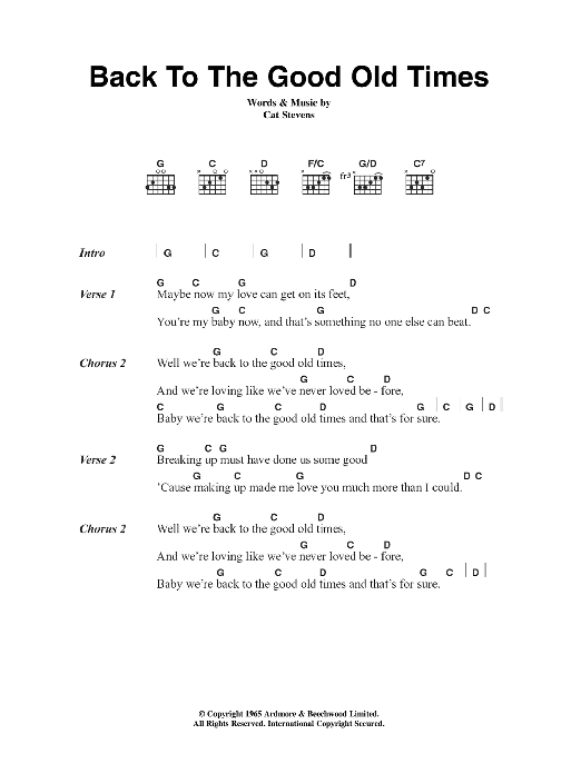 Download or print Cat Stevens Back To The Good Old Times sheet music, chords and digital score arranged for Guitar Chords/Lyrics. This Folk score includes 2 page(s).