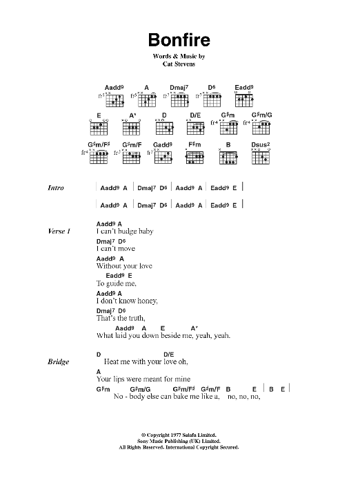 Download or print Cat Stevens Bonfire sheet music, chords and digital score arranged for Guitar Chords/Lyrics. This Pop score includes 3 page(s).