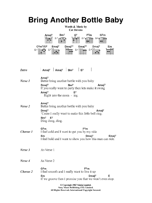 Download or print Cat Stevens Bring Another Bottle Baby sheet music, chords and digital score arranged for Guitar Chords/Lyrics. This Pop score includes 2 page(s).