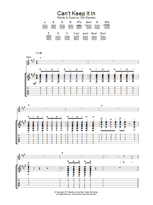 Download or print Cat Stevens Can't Keep It In sheet music, chords and digital score arranged for Guitar Tab. This Pop score includes 7 page(s).