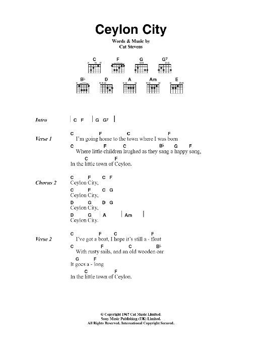 Download or print Cat Stevens Ceylon City sheet music, chords and digital score arranged for Guitar Chords/Lyrics. This Pop score includes 3 page(s).