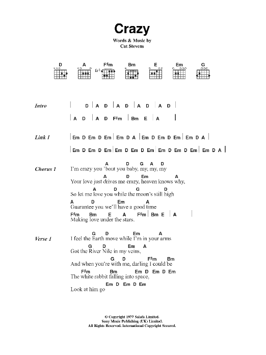 Download or print Cat Stevens Crazy sheet music, chords and digital score arranged for Guitar Chords/Lyrics. This Pop score includes 2 page(s).