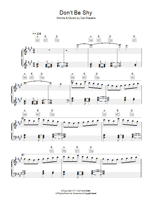 Download or print Cat Stevens Don't Be Shy sheet music, chords and digital score arranged for Piano, Vocal & Guitar Chords (Right-Hand Melody). This Pop score includes 3 page(s).