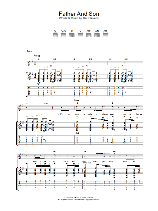 Download or print Cat Stevens Father And Son sheet music, chords and digital score arranged for Guitar Tab. This Folk score includes 7 page(s).
