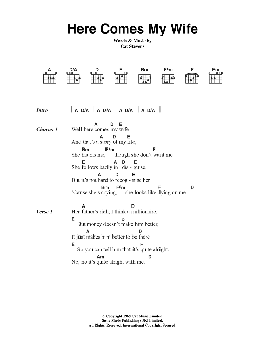 Download or print Cat Stevens Here Comes My Wife sheet music, chords and digital score arranged for Guitar Chords/Lyrics. This Pop score includes 2 page(s).