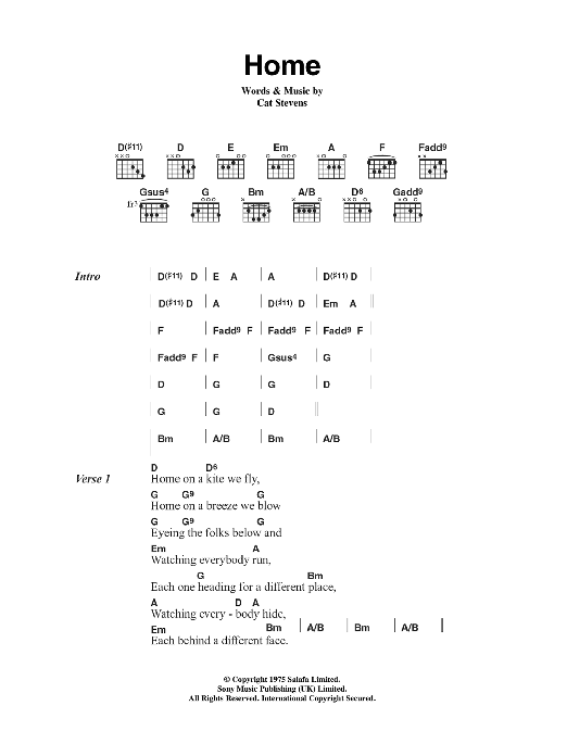 Download or print Cat Stevens Home sheet music, chords and digital score arranged for Guitar Chords/Lyrics. This Pop score includes 3 page(s).