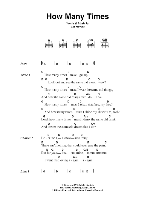 Download or print Cat Stevens How Many Times sheet music, chords and digital score arranged for Guitar Chords/Lyrics. This Pop score includes 2 page(s).