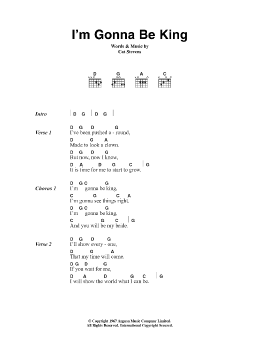 Download or print Cat Stevens I'm Gonna Be King sheet music, chords and digital score arranged for Guitar Chords/Lyrics. This Pop score includes 2 page(s).