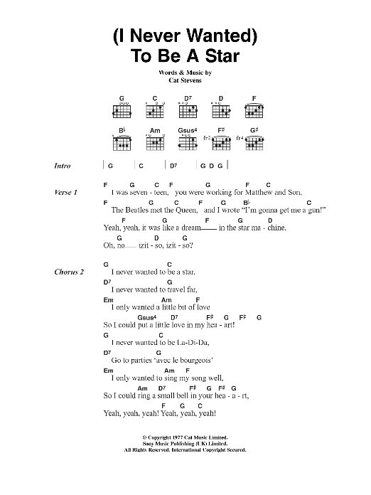 Download or print Cat Stevens (I Never Wanted) To Be A Star sheet music, chords and digital score arranged for Guitar Chords/Lyrics. This Pop score includes 2 page(s).