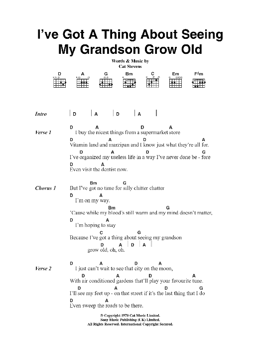 Download or print Cat Stevens I've Got A Thing About Seeing My Grandson Grow Old sheet music, chords and digital score arranged for Guitar Chords/Lyrics. This Pop score includes 2 page(s).