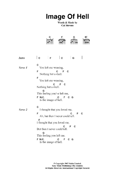 Download or print Cat Stevens Image Of Hell sheet music, chords and digital score arranged for Guitar Chords/Lyrics. This Pop score includes 2 page(s).