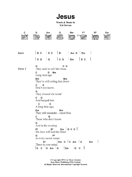 Download or print Cat Stevens Jesus sheet music, chords and digital score arranged for Guitar Chords/Lyrics. This Pop score includes 2 page(s).