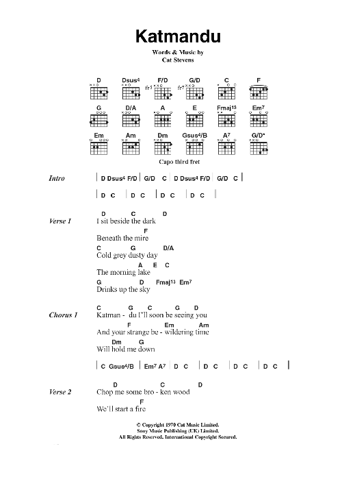 Download or print Cat Stevens Katmandu sheet music, chords and digital score arranged for Guitar Chords/Lyrics. This Pop score includes 2 page(s).