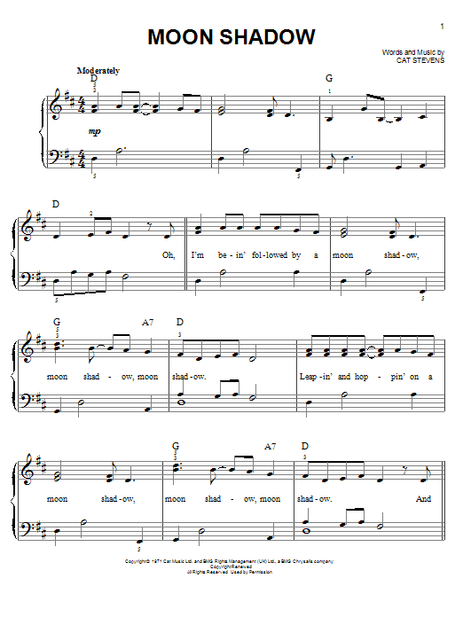 Download or print Cat Stevens Moon Shadow sheet music, chords and digital score arranged for Solo Guitar. This Folk score includes 2 page(s).