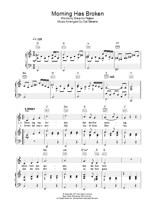 Download or print Cat Stevens Morning Has Broken sheet music, chords and digital score arranged for Piano Solo. This Folk score includes 5 page(s).