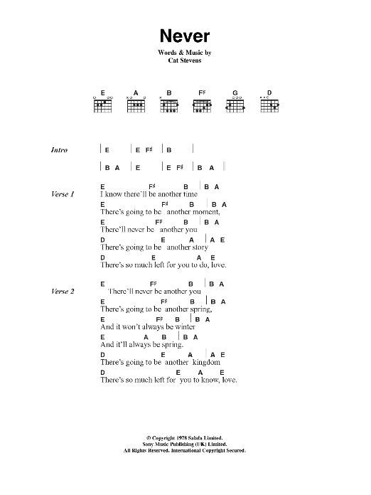 Download or print Cat Stevens Never sheet music, chords and digital score arranged for Guitar Chords/Lyrics. This Pop score includes 2 page(s).