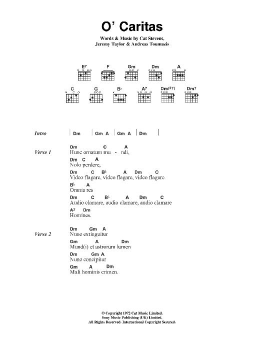 Download or print Cat Stevens O' Caritas sheet music, chords and digital score arranged for Guitar Chords/Lyrics. This Pop score includes 2 page(s).