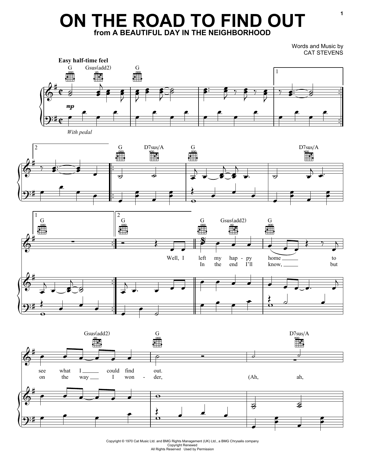 Download or print Cat Stevens On The Road To Find Out (from A Beautiful Day in the Neighborhood) sheet music, chords and digital score arranged for Piano, Vocal & Guitar Chords (Right-Hand Melody). This Children score includes 12 page(s).