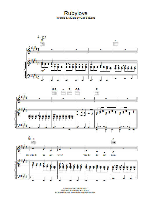 Download or print Cat Stevens Rubylove sheet music, chords and digital score arranged for Piano, Vocal & Guitar Chords. This Folk score includes 4 page(s).