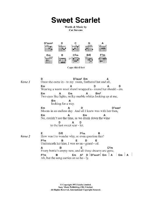 Download or print Cat Stevens Sweet Scarlet sheet music, chords and digital score arranged for Guitar Chords/Lyrics. This Pop score includes 2 page(s).