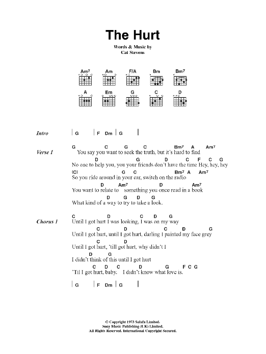 Download or print Cat Stevens The Hurt sheet music, chords and digital score arranged for Guitar Chords/Lyrics. This Pop score includes 3 page(s).