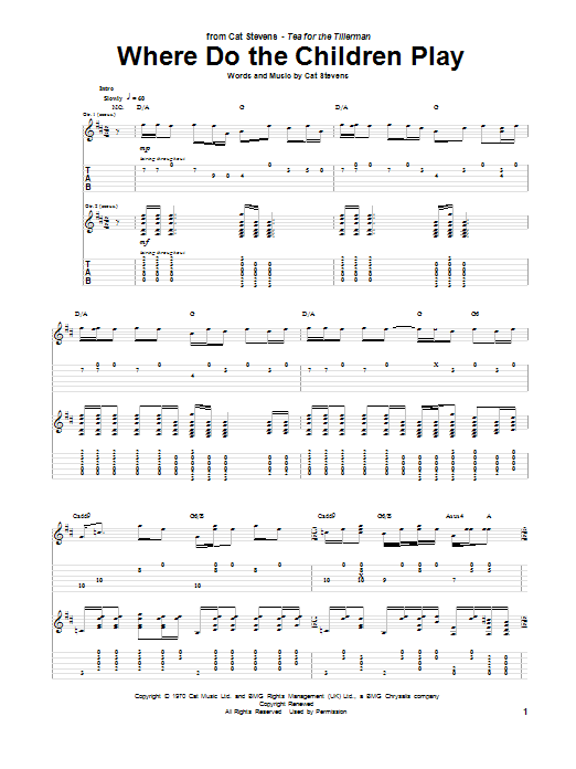 Download or print Cat Stevens Where Do The Children Play sheet music, chords and digital score arranged for Guitar Tab. This Pop score includes 10 page(s).