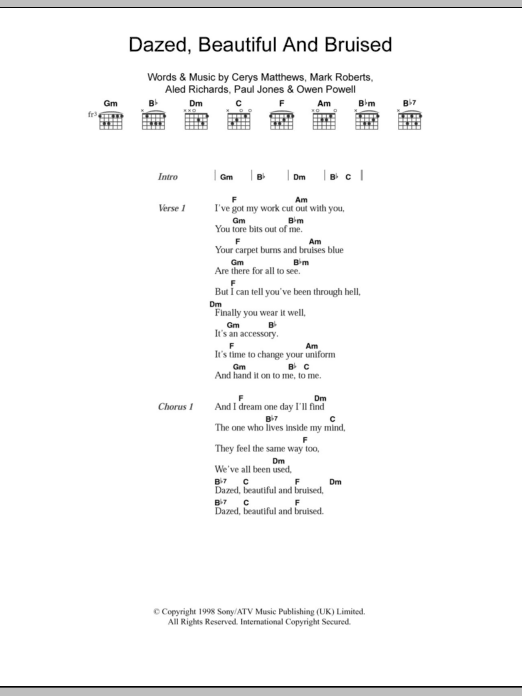 Download or print Catatonia Dazed, Beautiful And Bruised sheet music, chords and digital score arranged for Guitar Chords/Lyrics. This Rock score includes 2 page(s).