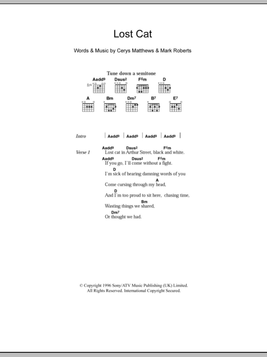 Download or print Catatonia Lost Cat sheet music, chords and digital score arranged for Guitar Chords/Lyrics. This Rock score includes 2 page(s).