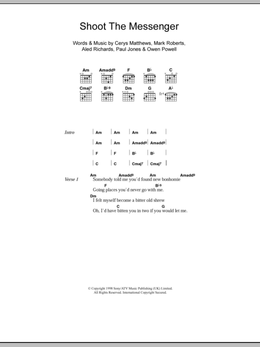 Download or print Catatonia Shoot The Messenger sheet music, chords and digital score arranged for Guitar Chords/Lyrics. This Rock score includes 3 page(s).
