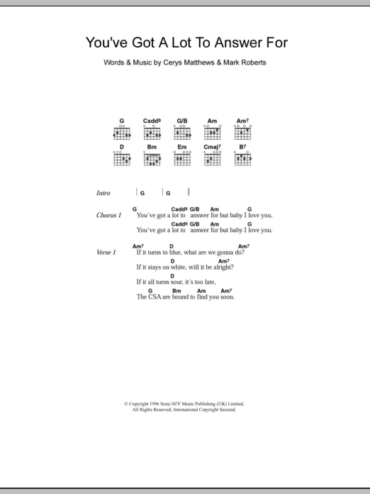 Download or print Catatonia You've Got A Lot To Answer For sheet music, chords and digital score arranged for Guitar Chords/Lyrics. This Rock score includes 2 page(s).