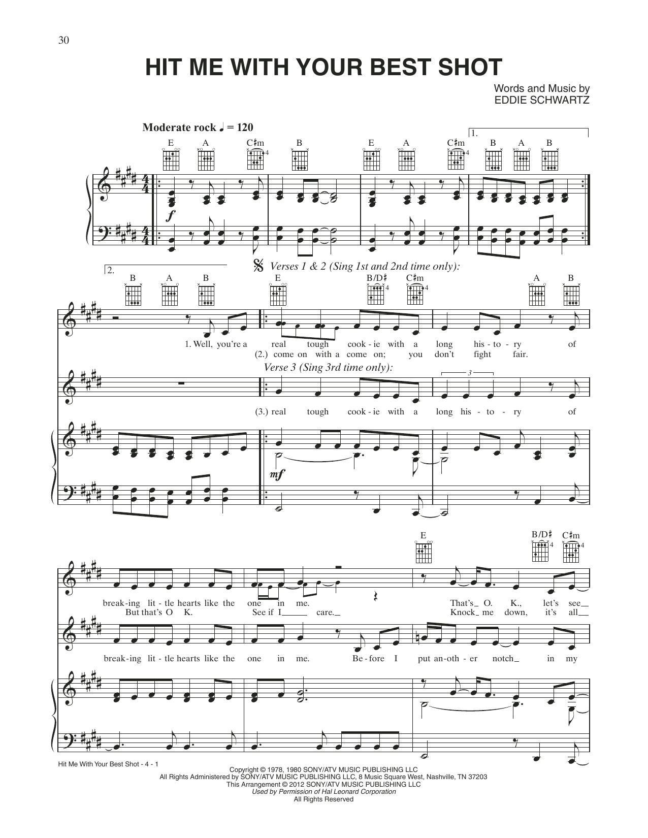 Download or print Catherine Zeta-Jones Hit Me With Your Best Shot (from Rock Of Ages) sheet music, chords and digital score arranged for Piano, Vocal & Guitar Chords (Right-Hand Melody). This Rock score includes 4 page(s).