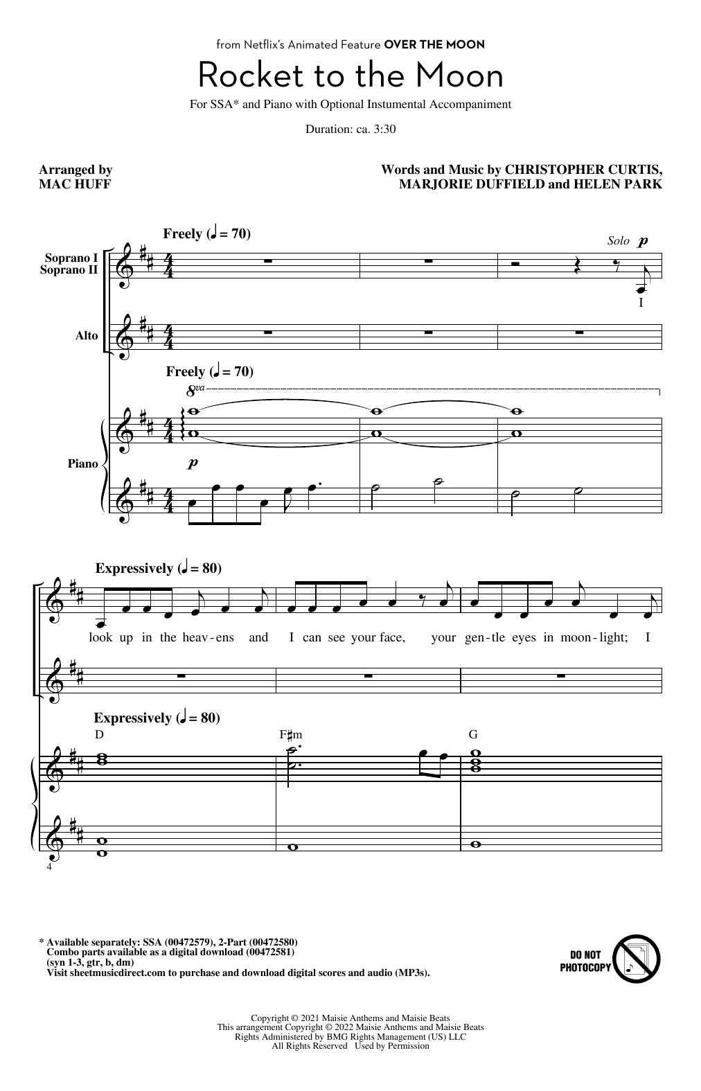 Download or print Cathy Ang Rocket To The Moon (from Over The Moon) (arr. Mac Huff) sheet music, chords and digital score arranged for SSA Choir. This Film/TV score includes 10 page(s).