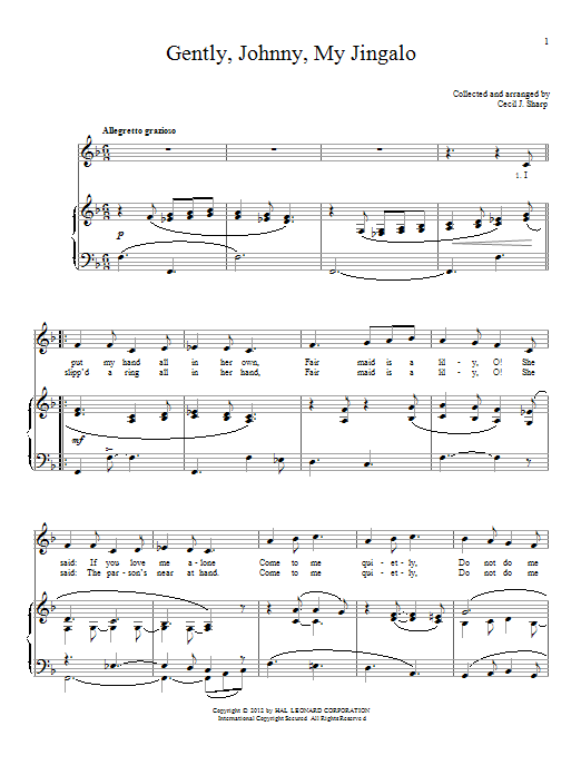 Download or print Cecil J. Sharp Gently, Johnny, My Jingalo sheet music, chords and digital score arranged for Piano & Vocal. This Folk score includes 2 page(s).