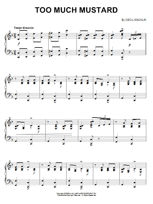 Download or print Cecil Macklin Too Much Mustard sheet music, chords and digital score arranged for Piano Solo. This Jazz score includes 6 page(s).