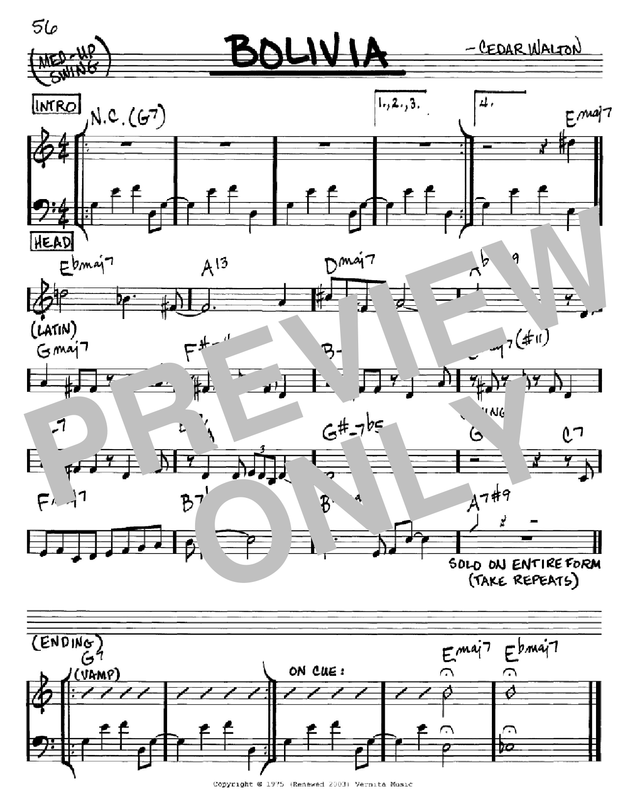 Download or print Cedar Walton Bolivia sheet music, chords and digital score arranged for Real Book – Melody & Chords – C Instruments. This Jazz score includes 1 page(s).
