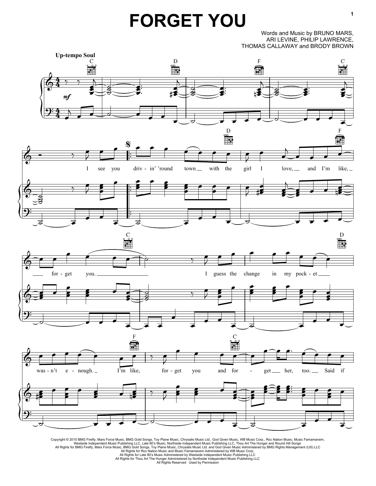 Download or print Cee Lo Green F**k You (Forget You) sheet music, chords and digital score arranged for Piano, Vocal & Guitar Chords (Right-Hand Melody). This Pop score includes 8 page(s).