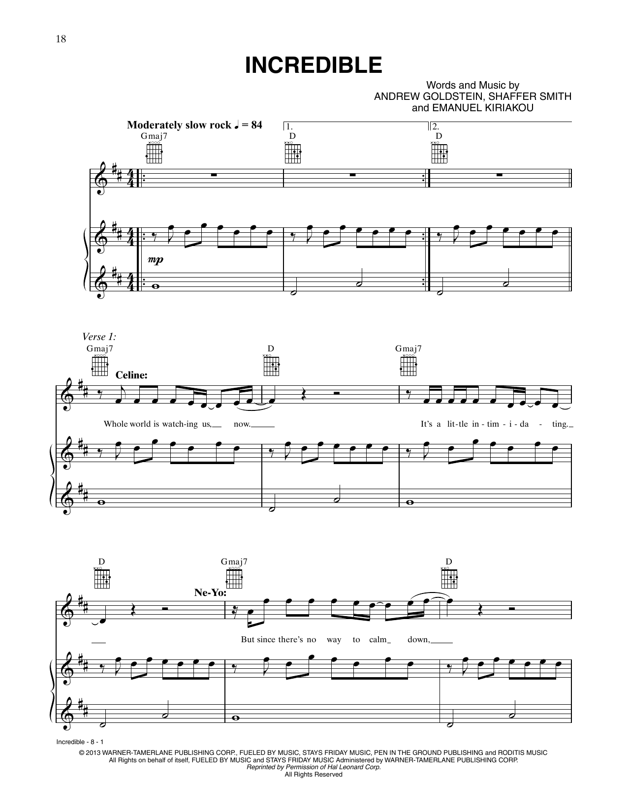 Download or print Céline Dion and Ne-Yo Incredible sheet music, chords and digital score arranged for Piano, Vocal & Guitar Chords (Right-Hand Melody). This Pop score includes 8 page(s).