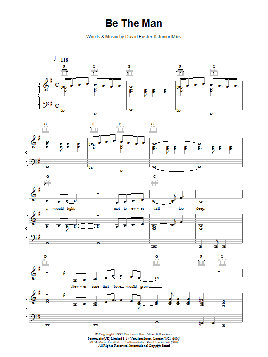 Download or print Celine Dion Be The Man sheet music, chords and digital score arranged for Piano, Vocal & Guitar Chords. This Pop score includes 6 page(s).