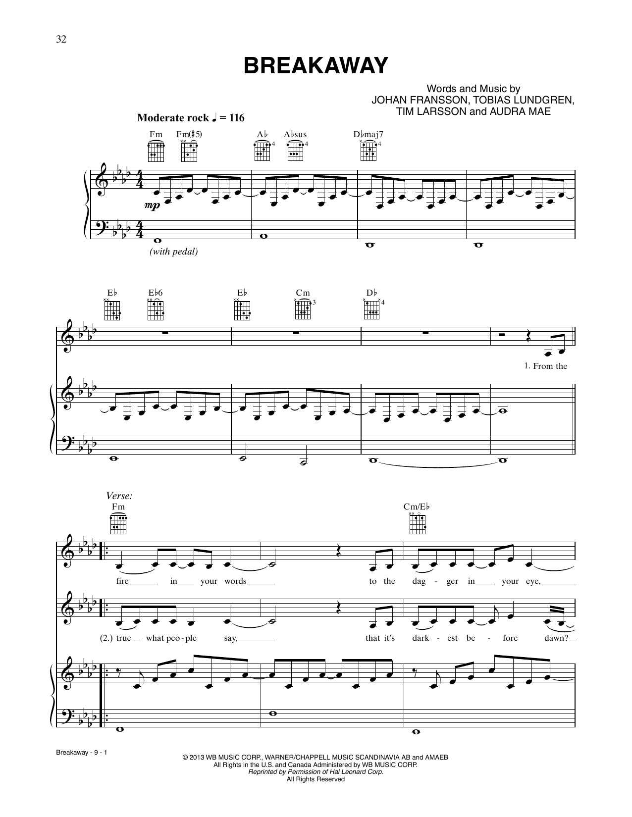 Download or print CÉLINE DION Breakaway sheet music, chords and digital score arranged for Piano, Vocal & Guitar Chords (Right-Hand Melody). This Pop score includes 9 page(s).