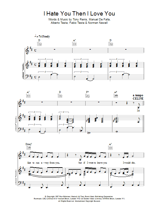 Download or print Celine Dion I Hate You Then I Love You sheet music, chords and digital score arranged for Piano, Vocal & Guitar Chords. This Pop score includes 7 page(s).