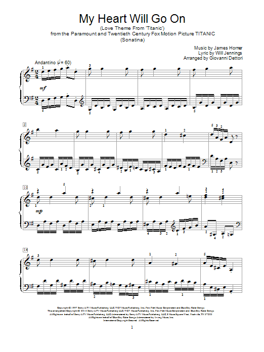 Download or print Giovanni Dettori My Heart Will Go On (Love Theme from Titanic) sheet music, chords and digital score arranged for Educational Piano. This Film/TV score includes 4 page(s).
