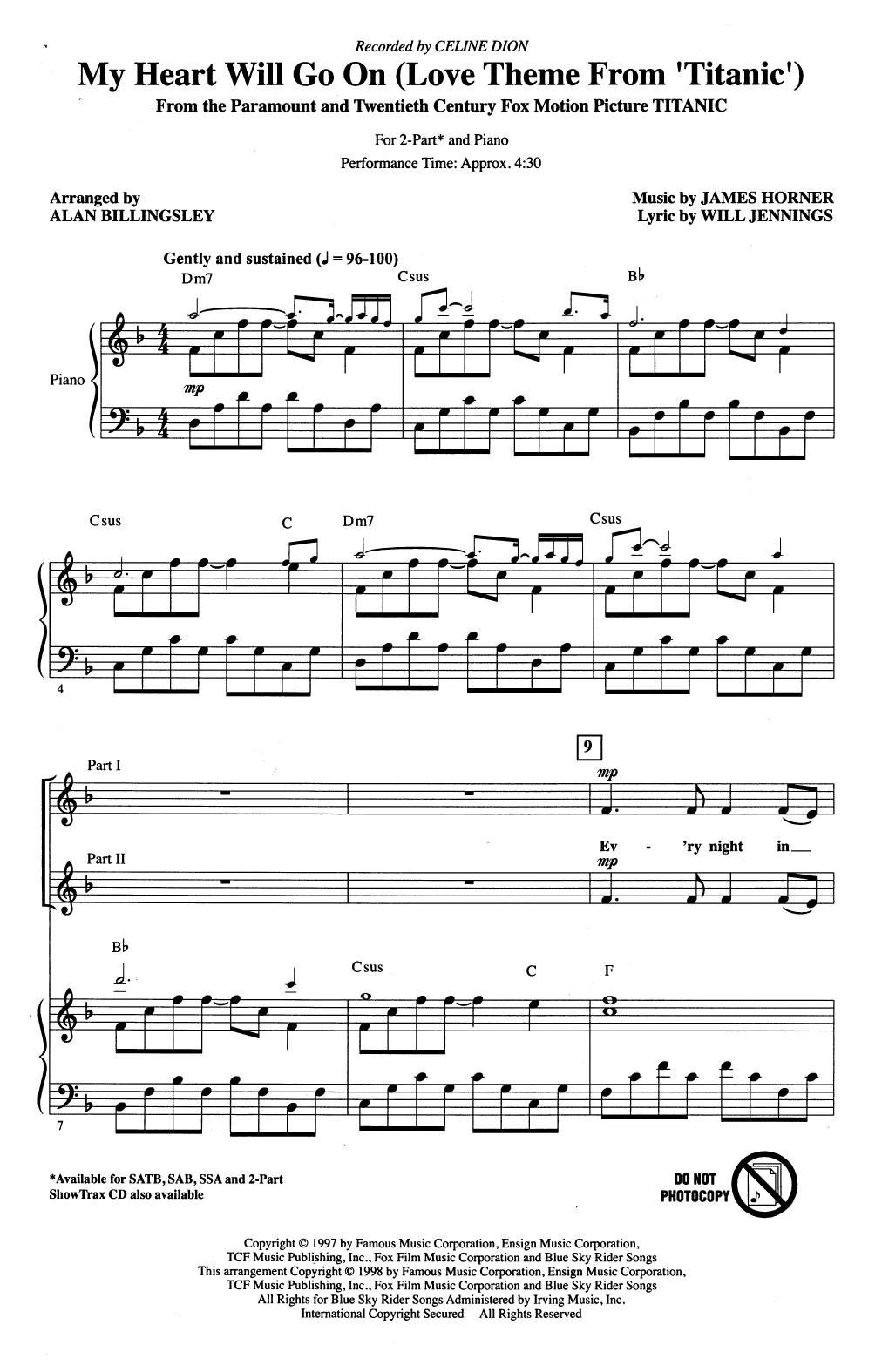 Download or print Celine Dion My Heart Will Go On (Love Theme From 'Titanic') (arr. Alan Billingsley) sheet music, chords and digital score arranged for SAB Choir. This Film/TV score includes 10 page(s).
