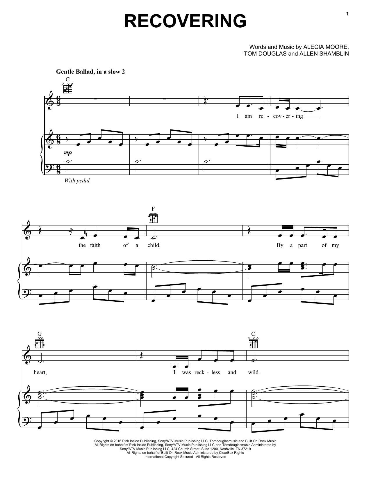 Download or print Celine Dion Recovering sheet music, chords and digital score arranged for Piano, Vocal & Guitar Chords (Right-Hand Melody). This Pop score includes 6 page(s).