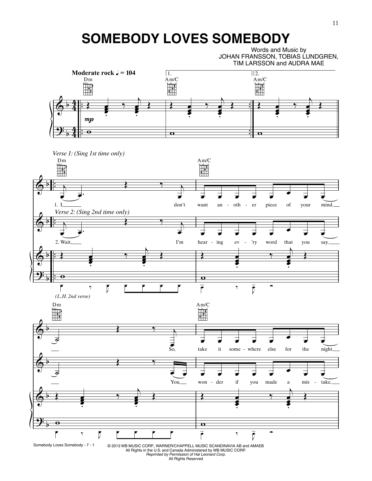 Download or print CÉLINE DION Somebody Loves Somebody sheet music, chords and digital score arranged for Piano, Vocal & Guitar Chords (Right-Hand Melody). This Pop score includes 7 page(s).