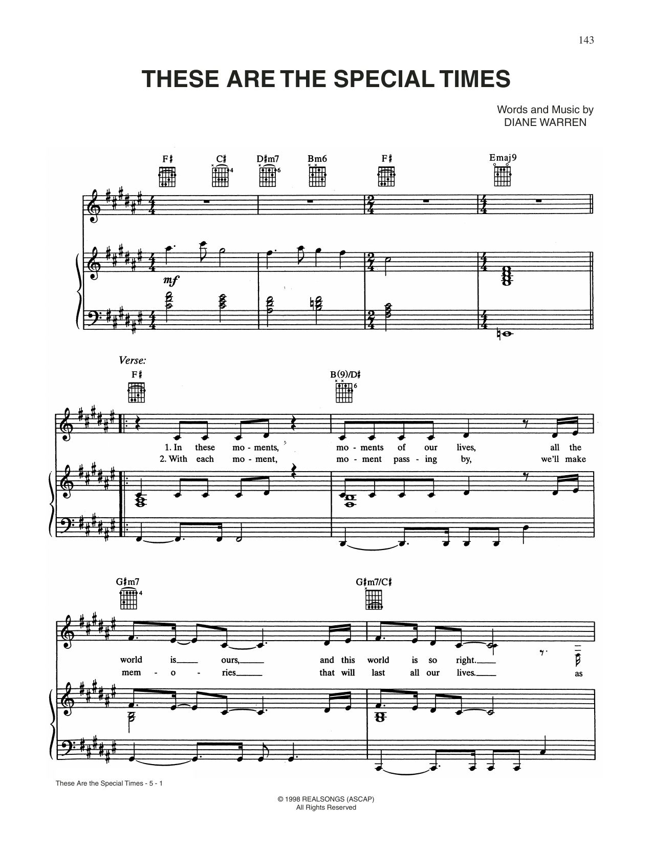 Download or print CÉLINE DION These Are Special Times sheet music, chords and digital score arranged for Piano, Vocal & Guitar Chords (Right-Hand Melody). This Pop score includes 5 page(s).