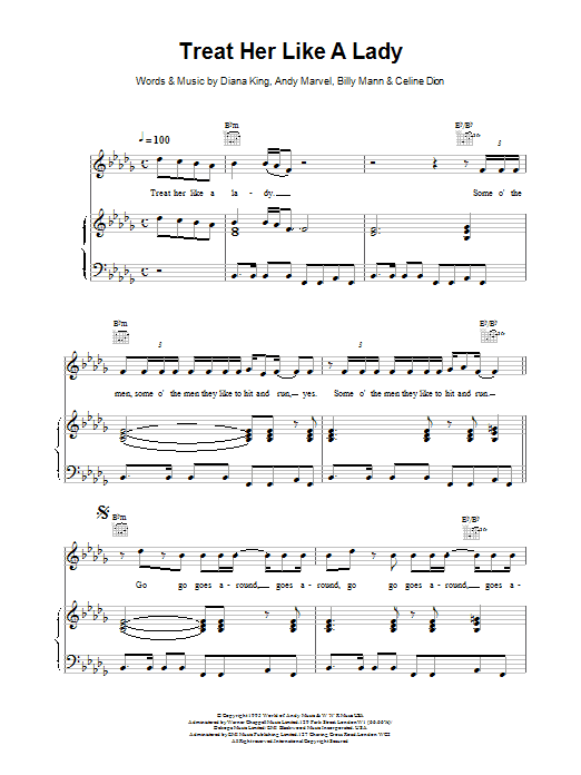 Download or print Celine Dion Treat Her Like a Lady sheet music, chords and digital score arranged for Piano, Vocal & Guitar Chords. This Pop score includes 6 page(s).
