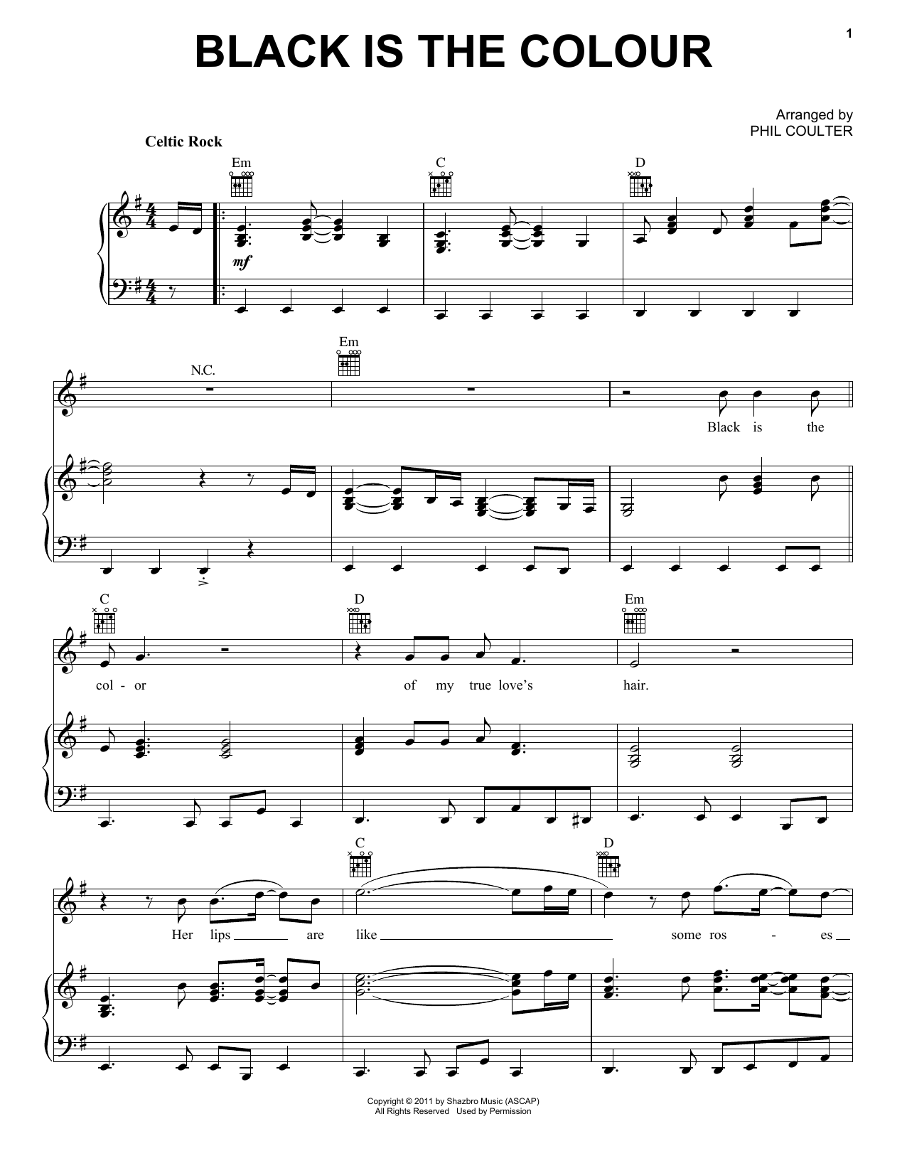 Download or print Celtic Thunder Black Is The Colour sheet music, chords and digital score arranged for Piano, Vocal & Guitar Chords (Right-Hand Melody). This Pop score includes 7 page(s).