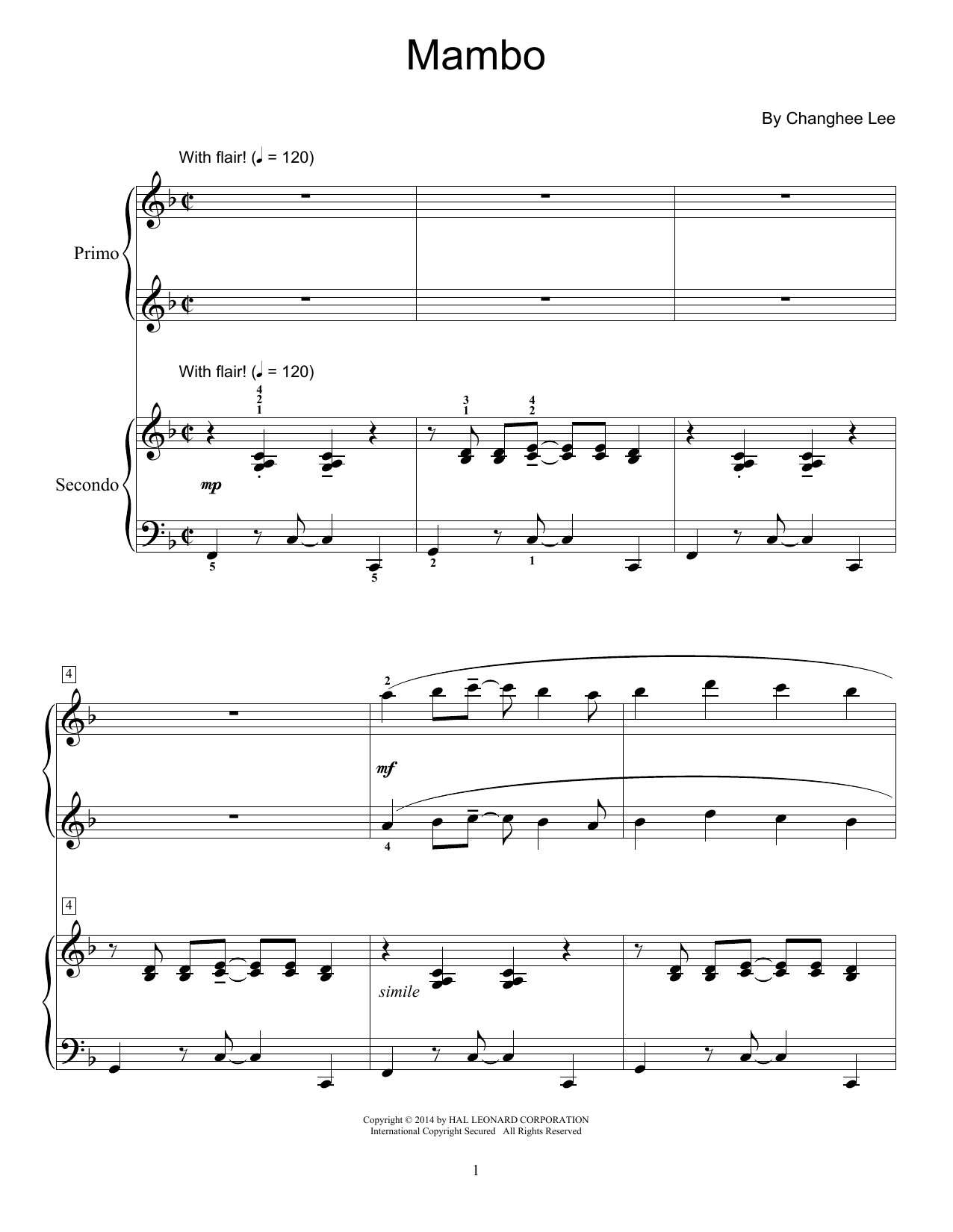 Download or print Changhee Lee Mambo sheet music, chords and digital score arranged for Piano Duet. This Children score includes 10 page(s).
