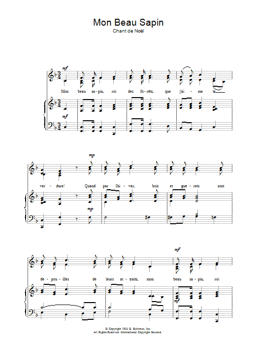 Download or print Christmas Carol Mon Beau Sapin sheet music, chords and digital score arranged for Piano, Vocal & Guitar Chords. This Christmas score includes 2 page(s).